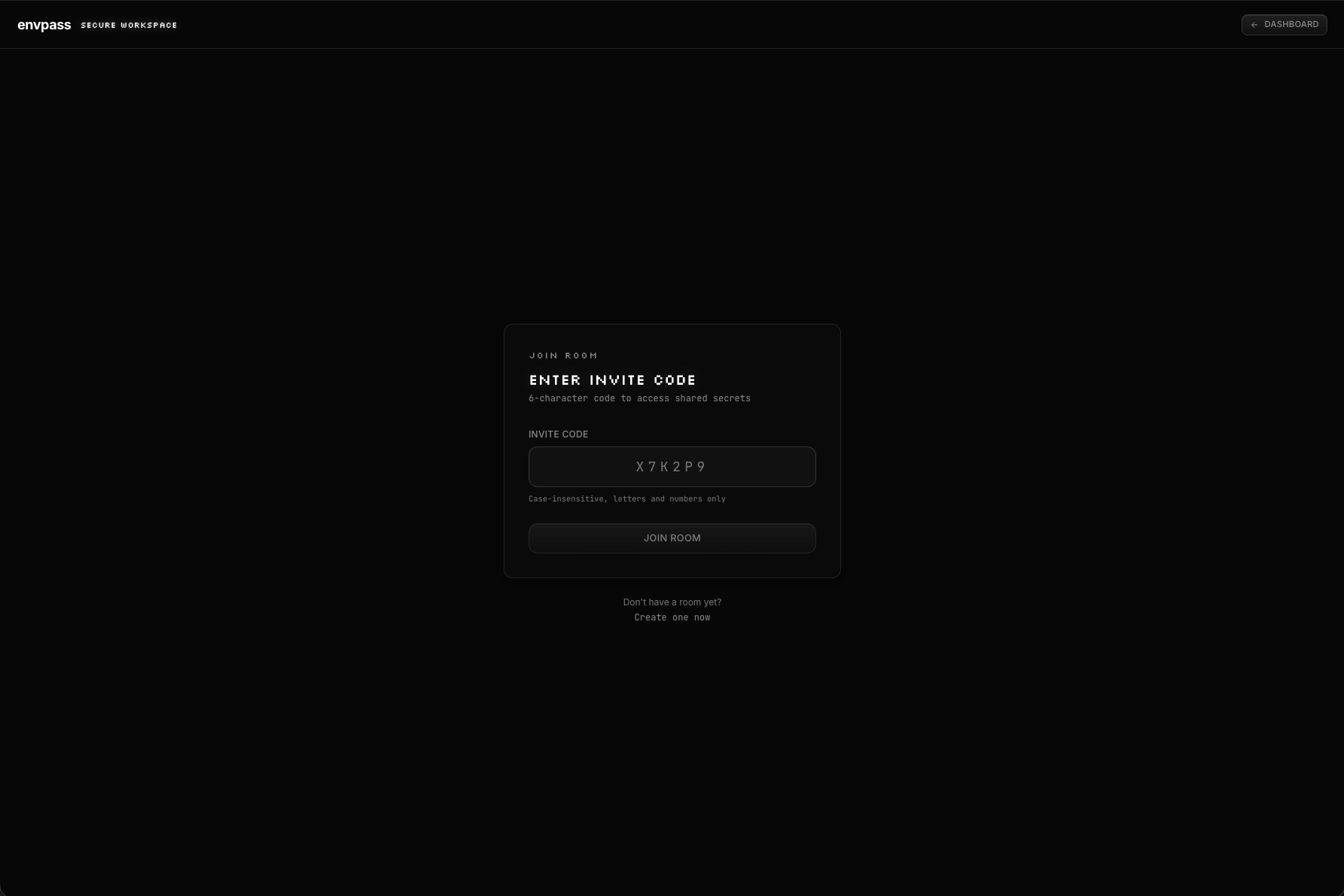 envpass is a web app purpose-built for the hackathon use case. A room owner creates a vault, gets a short invite code they can share verbally or via text, and teammates join to access encrypted secrets in real-time.