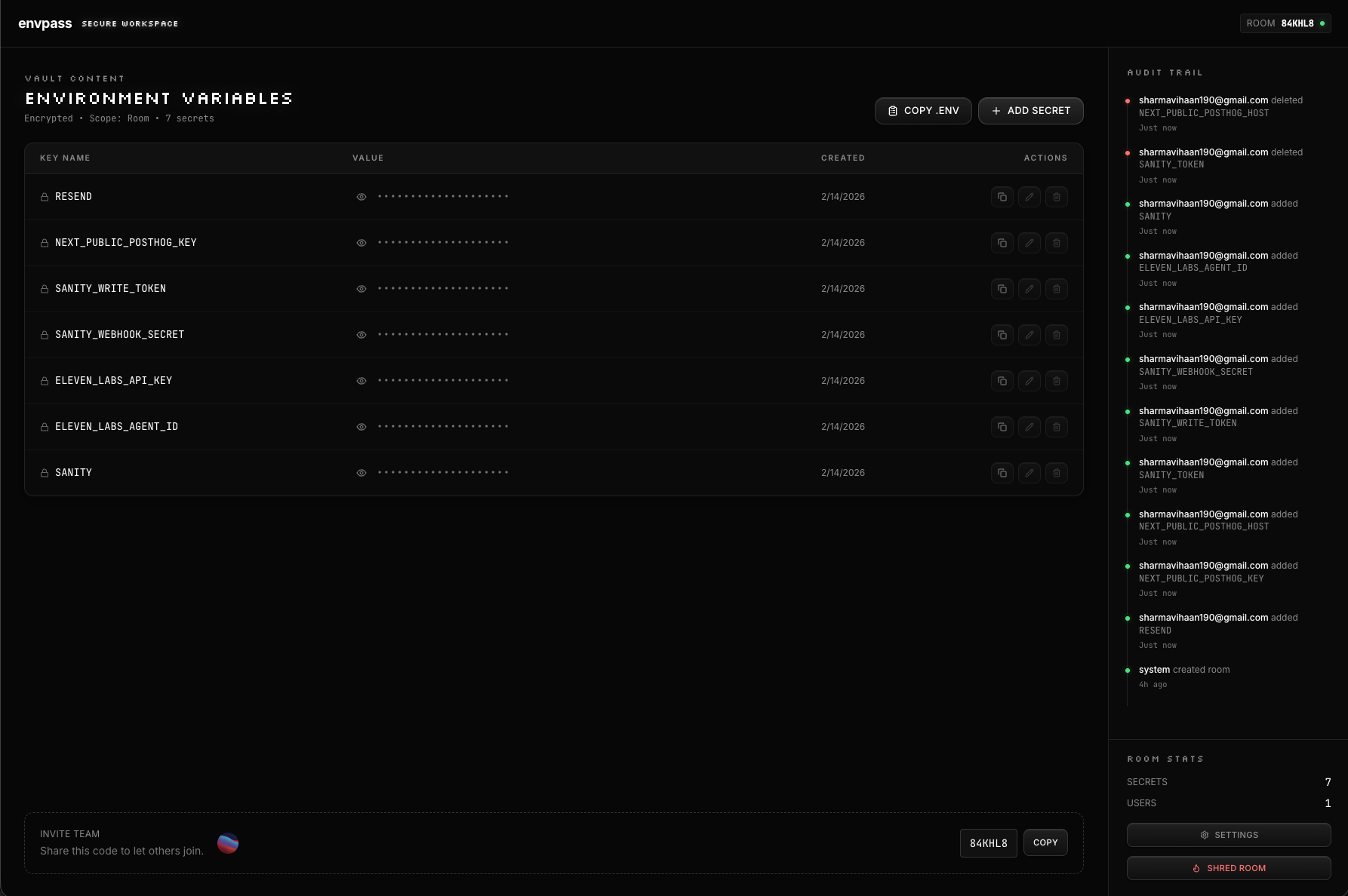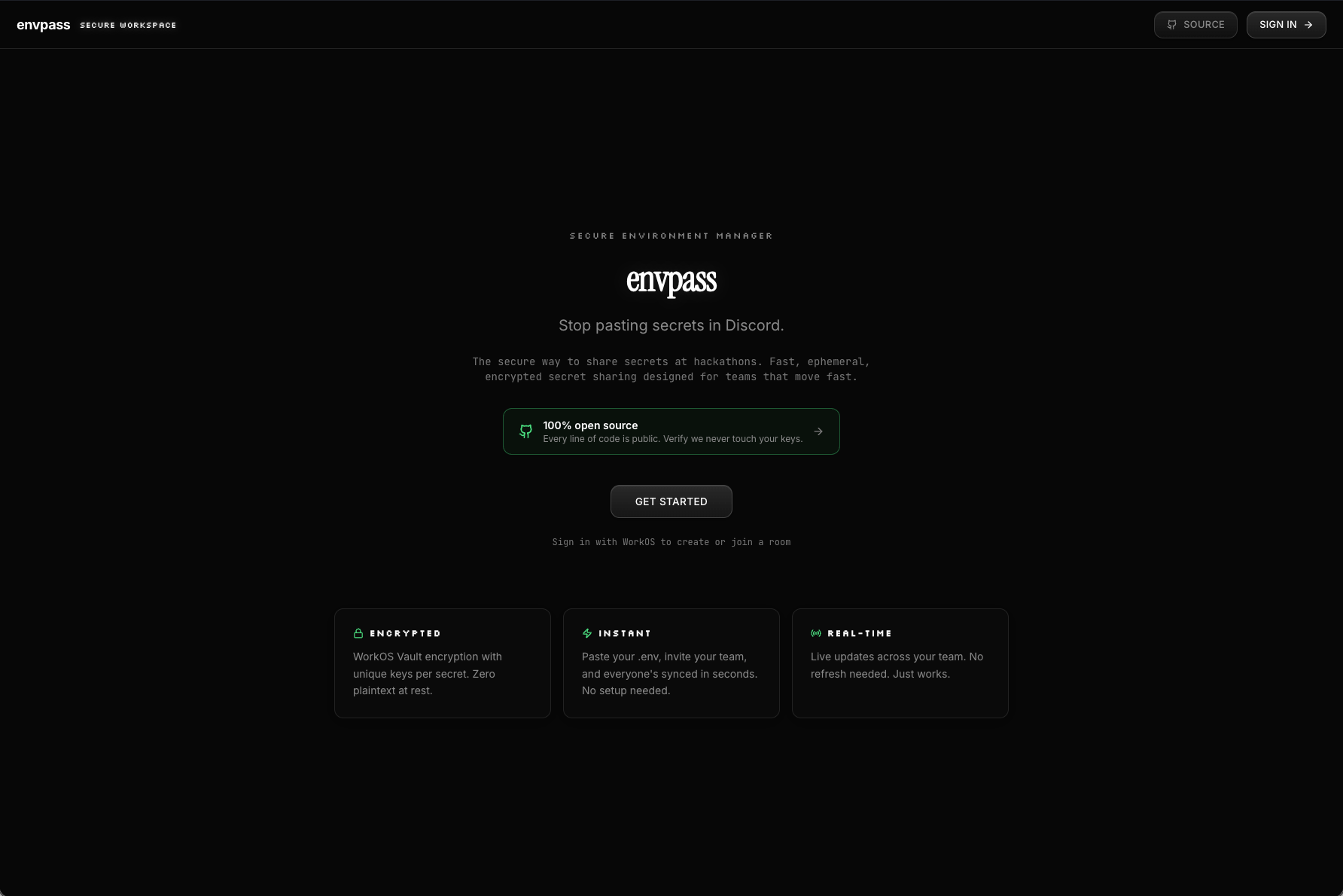 envpass replaces that entire workflow with a secure, real-time vault. Create a room, get a 6-character invite code, and your team has an encrypted space to share secrets — synced instantly via Convex, encrypted at rest via WorkOS Vault, and shredded when the hackathon's over.